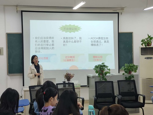 交流会由唐青主持。座谈会伊始,唐青向大家介绍了此次座谈会的目的,表达了学校和学院对ACCA项目的重视和大力支持。首先进行的是师生交环节。同学们表述了学习ACCA的感受,提出了自身在学习过程中遇到的困难与疑问。副院长谢朝华对学生的积极学习状态表示肯定,针对大家的困惑,提出了会计学专业学习、ACCA考试与学习方面的专业性指导意见。同时,他也指出了学生在ACCA学习中出现的功利倾向,建议大家在考证的同时,也要把会计学基础学扎实等。副书记唐青则建议学生考证与专业学习两手都要抓,但要注意方式方法,同时也要注重个人综合素质的提升,处理好学习与自我管理、学习与身心健康等关系。中博教育陈文老师则对学生们提出的关于课程内容与难度、网课进度问题、教学老师的指导等进行了详细答疑。紧接着是经验分享环节,由437必赢会员中心经管学院2017级ACCA方向班李昊与中南林业科技大学2017级ACCA方向班陆佳密同学主讲。两位同学均为ACCA课程全部通过的学生,结合自身学习与考证经历,传授经验与干货,并现场答疑交流。最后一个环节为心理健康教育环节,由李丽兰主讲。李老师结合特色方向班的学生的心理特点与需求,从如何正确认识压力、如何运用情绪ABC理论调整学业压力等方面进行指导。