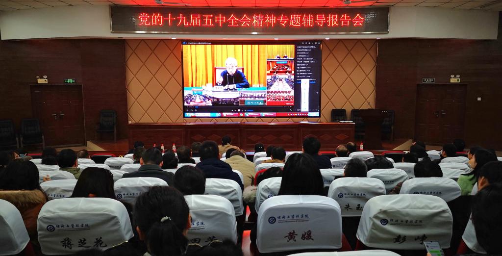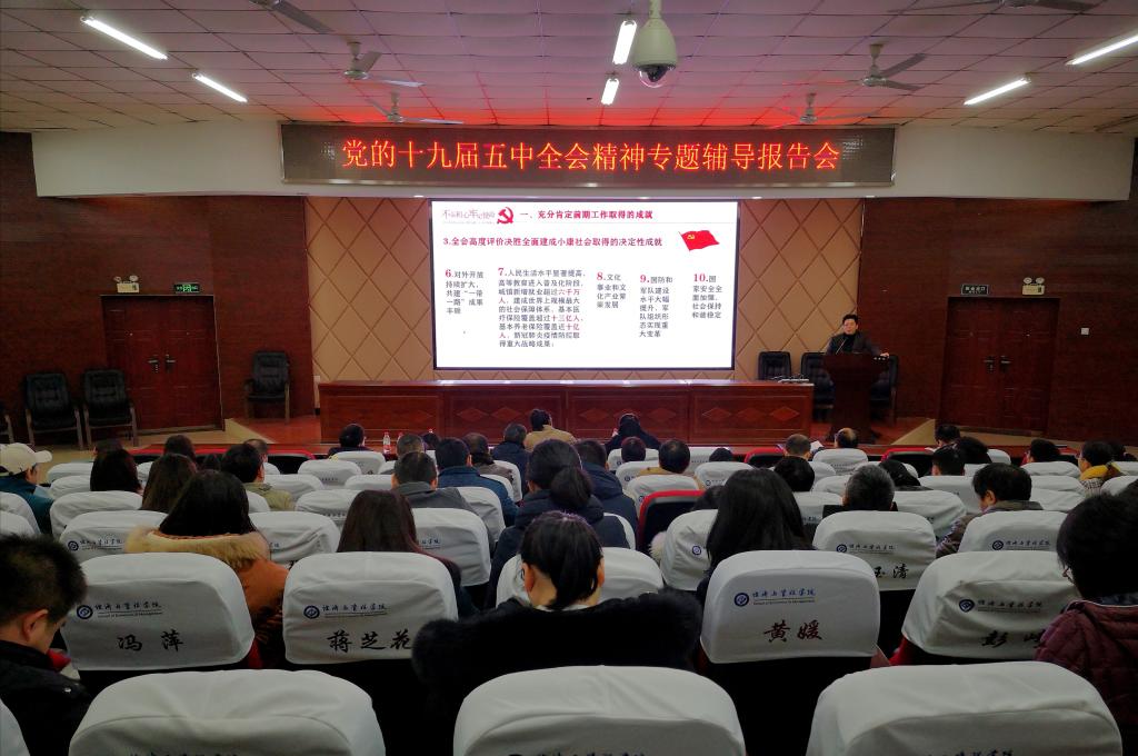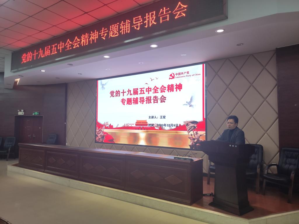 12月8日下午,我院在文科楼A200举行党的十九届五中全会精神专题辅导报告会,院党委书记王宏作报告,学院全体教职工160余人参加。院党委书记王宏主持报告会。