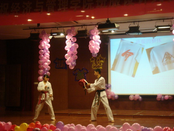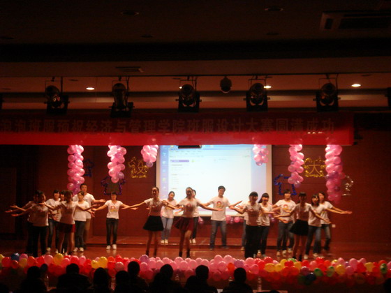参加比赛的十个班级依次登台,为在场观众带来精心准备的班服展示秀。同学们身着设计精致的班服,踩着轻快的音乐节拍登上舞台,通过表演用心编排的节目展示本班的班服,伴以解说员对设计理念的解说,给在场观众带来一场视听盛宴。其中,会计1304班在班服展示秀中穿插了精彩的跆拳道表演,引得台下观众阵阵叫好。财管1302班的集体舞《为青春跳支舞》展现了同学们的青春与活力,自信的笑容感染了每个人。金融1303班的ppt解说员激情澎湃的解说将现场气氛推向高潮,给大家留下了深刻的印象。