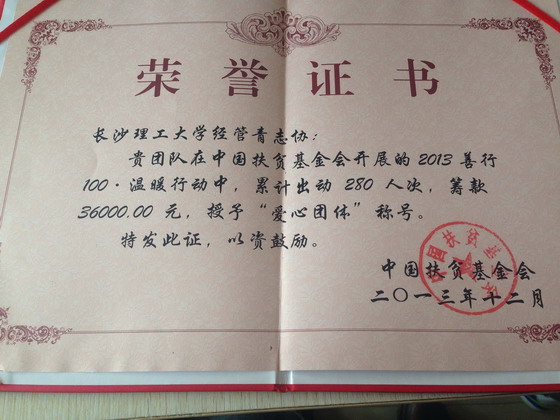 在我院的认真组织、积极开展下,通过我院志愿者们的不懈努力,本次“善行100”劝募活动成效显著。截止到目前,我院共连续参与12次,出动志愿者总计三百多人次,募得善款数万元,善款数额位居必赢官网参与此次活动的各志愿团体第一。2013年12月,中国扶贫基金会向我院青志协授予“爱心团体”称号并颁发证书,肯定了我院在本次活动中的工作。
