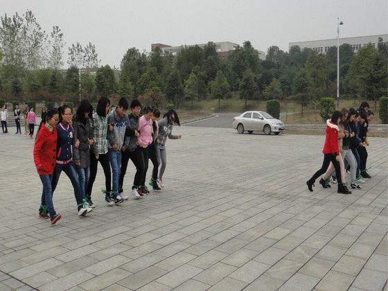 新生心理拓展训练一共分为三个环节。第一个环节是认识你我,团队热身游戏—“棒打薄情郎”,目的是增加成员之间的熟悉度和信任度,有利于后续活动的顺利开展;第二个环节是“阳光伙伴”绑腿跑活动,旨在培养组员团结、互助、克服困难的团队精神;第三个环节是“无轨电车”活动,通过训练建立小组队员间的相互信赖和合作关系。在每个环节结束后,老师都穿插了“分享感悟”环节,帮助学生体会在心理拓展训练中的感悟和成长。每位成员都积极投入,通过分组与合作,体会了团队的力量。广场上不时传来队员们训练时整齐划一的口号声、享受运动带来快乐的欢笑声、帮助队员加油鼓劲的呐喊声以及为队员获得胜利的掌声。开心、热烈的氛围,引起过往的路人也忍不住停下来驻足观看。在分享环节时,每位队员都感触颇多,认为这次拓展训练不但“好玩”,而且“有用”。
