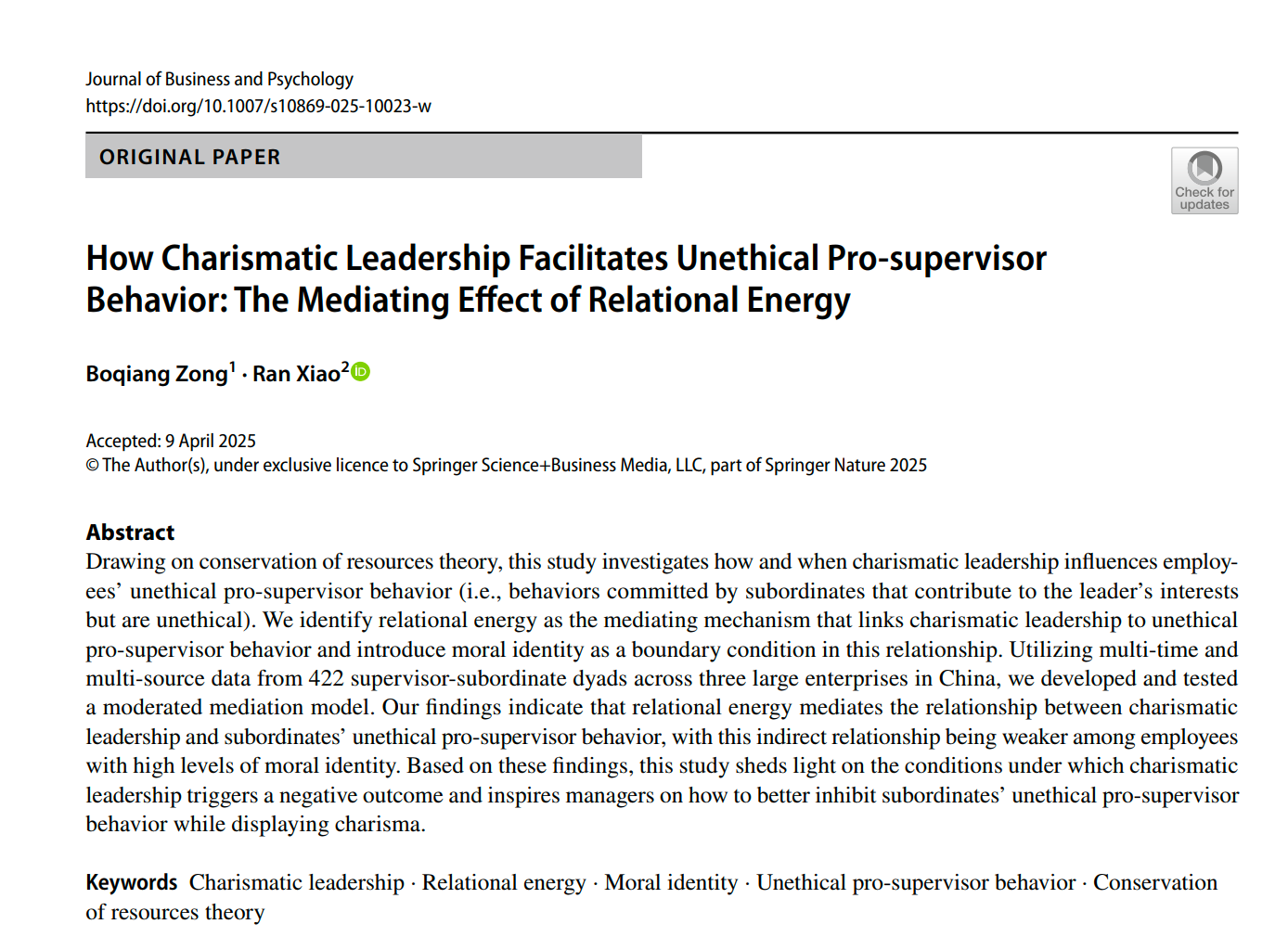 近日,我院教师宗博强博士的论文“How Charismatic Leadership Facilitates Unethical Pro‑supervisor Behavior: The Mediating Effect of Relational Energy”在国际学术期刊《Journal of Business and Psychology》线上刊发,论文第一署名单位为437必赢会员中心,合作者有中国人民大学博士生肖然。DOI:https://doi.org/10.1007/s10869-025-10023-w。