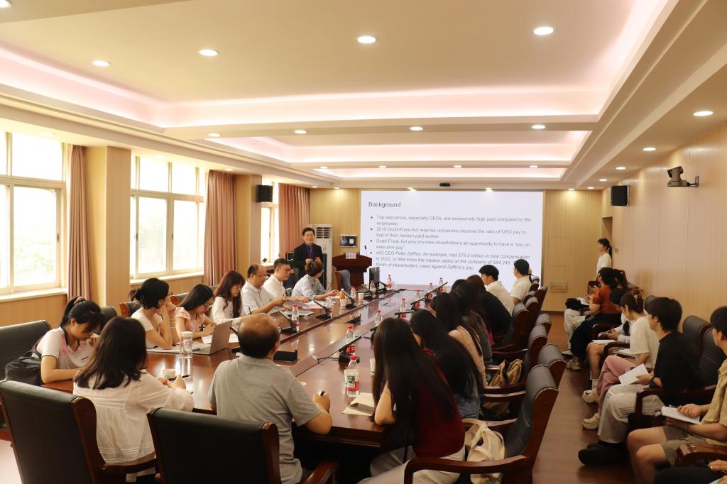 讲座接近尾声时,朱锐对本次讲座做出总结。他肯定了讲座在揭示高管薪酬制度、股东话语权与公司绩效之间复杂关系方面的重要价值,并鼓励同学们以此次讲座为契机,对学术论文选题、实证研究设计和国际学术资源拓展进行深入思考。最后,他感谢HUISHAN WAN教授的精彩分享和师生们的积极参与。
