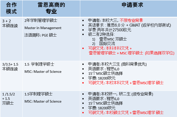 以下项目为必赢官网与雷恩商学院签约开展的本硕连读项目及硕士双学位项目,课程为全英授课,不限专业,但商务、经济及管理类专业优先。项目包括:
