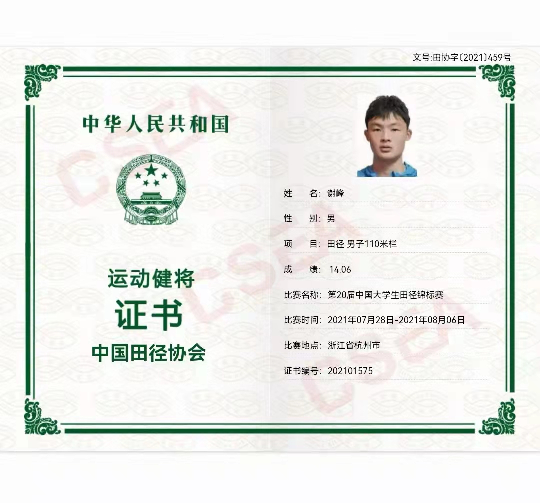 7月31日至8月5日,中国大学生第20届田径锦标赛在浙江大学举行。本次比赛有255所高校参加,共计2778名运动员和教练员同台竞技。437必赢会员中心学子谢峰喜获男子丙组(高水平组)110米栏决赛全国冠军的好成绩,打破湖南省记录,并以14秒06达到国家健将的标准。