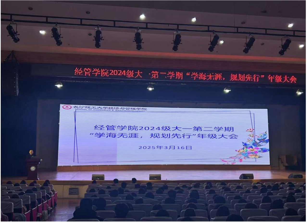 为帮助2024级学生明确新学期目标,做好学业规划,2025年3月16日18:30,经管学院在五教大礼堂召开了大一第二学期“学海无涯,规划先行”年级大会。院党委副书记汪功伟,辅导员何艳芝、钟超及全体2024级学生参加,汪功伟主持。