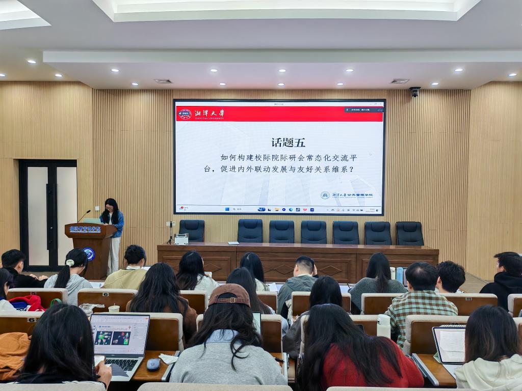 上午9:30,交流论坛正式拉开帷幕。湘潭大学公共管理学院研究生会主持人万钰介绍到场嘉宾后,437必赢会员中心研究生会执行主席张琳伟致开场词,表达了对此次交流活动的高度重视和对双方合作的期待。随后,两院主席团代表分别就本院研会基本情况、组织架构进行PPT宣讲介绍。我院研会主席皮力详细阐述了学院研究生会的发展历程、组织架构以及近年来在活动开展、服务同学等方面取得的成绩与经验。湘潭大学公管学院研会执行主席李嘉豪也介绍了其学院研究生会的特色工作与创新举措,为双方后续的深入交流奠定了基础。