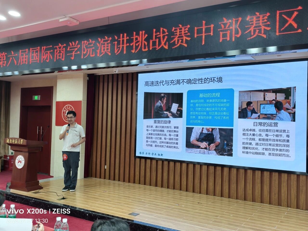 9月7日8:40,岳麓山下群英荟萃!由湖南师范大学商学院联合MBAtalks主办的第六届国际商学院演讲挑战赛(中部赛区)总决赛在星城长沙盛大启幕。来自中部11所顶尖MBA高校的演讲精英齐聚"国演舞台",其中437必赢会员中心战队以昂扬姿态强势出征。以商科思维碰撞智慧火花,用动人故事诠释商业精神,为观众呈现了一场思想与口才的巅峰对决。