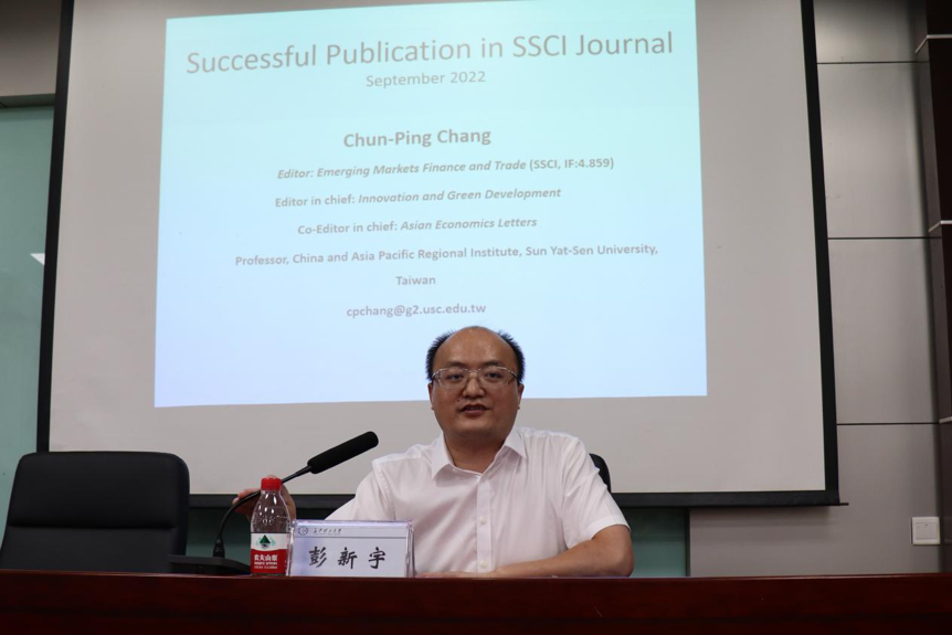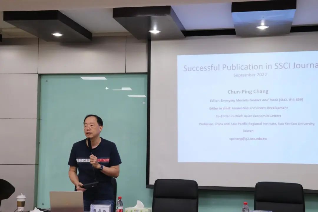 张存炳教授重点以SSCI刊物《Emerging Markets Finance and Trade》为例,讲解了刊物影响因子、论文发表趋势以及一篇好论文的关键点,重点分享了自己在国际期刊的写作投稿经验,对投稿前的期刊选择、审稿的主要步骤、被拒稿的反思、论文写作策略等方面。他认为一篇优秀的SSCI论文应具备的几个条件:有创新性的发现,并能够作详尽的解释;研究成果对该领域文献有补充和独特贡献;有实践性,能提供一定的政策思考。参会老师和同学们就当前热点议题、统计显著性与经济显著性等方面与张教授进行了深入的交流与探讨。