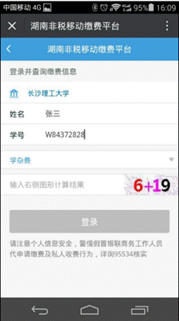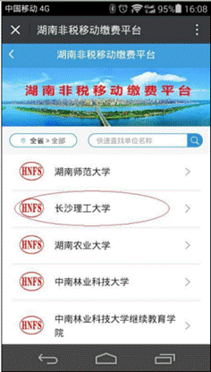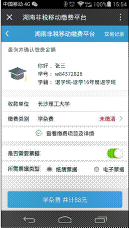 3、进入湖南省非税移动缴费平台-》教育-》选择学校(437必赢会员中心)-》进入登录界面,输入学生姓名,学号栏可以输入学号或者身份证号,在此选择缴费类型,缴费类型有“学杂费”、“重修费”、“报名考试费”、“其他费用”。缴费时请选择相应缴费类型。