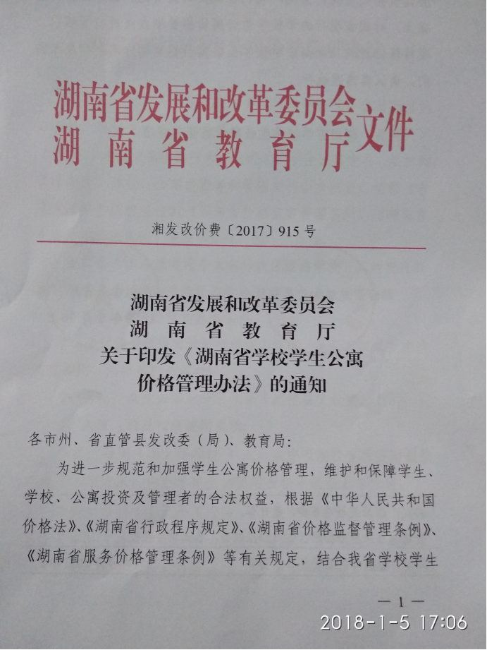 湖南省发展和改革委员会湖南省教育厅 关于印发《湖南省学校学生公寓价格管理办法》的通知
