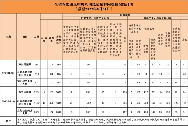 全省查处违反中央八项规定精神问题情况统计表(截至2022年8月31日)