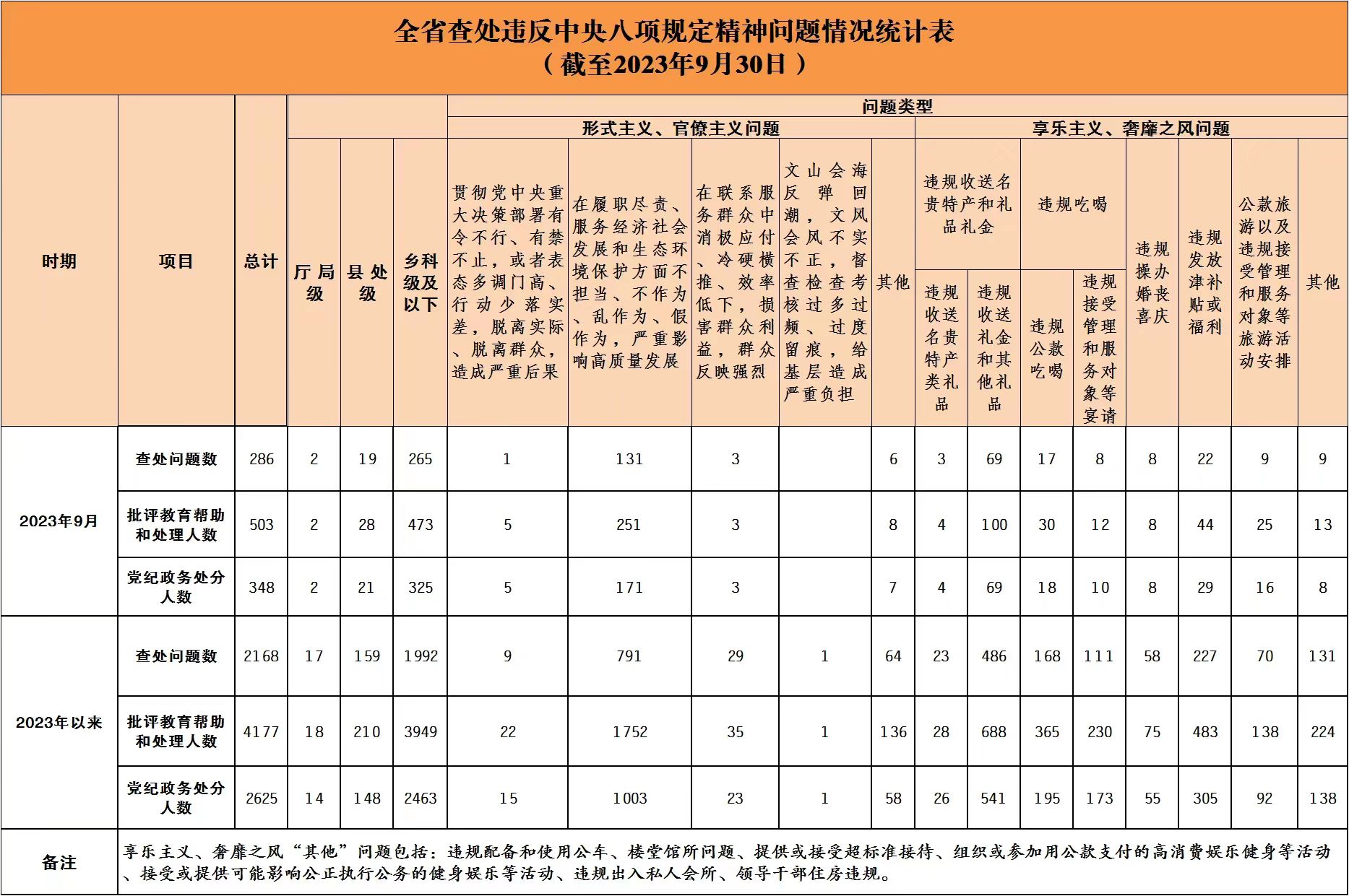 2023年9月全省查处违反中央八项规定精神问题286起