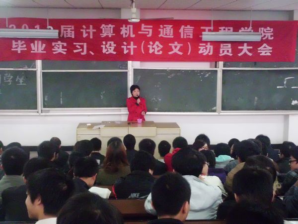 为推动我院2012届毕业设计、毕业实习工作,提高专业人才培养的质量,计算机与通信工程学院于1118日下午1400在金盆岭12300教室隆重举行2012届毕业设计(论文)、毕业实习动员大会,会议由教务办主任毛云芳老师主持。我院主管教学工作的龙敏副院长、网络教研室易建勋老师、教务办杨雪芹老师、学工办邵巧艳老师出席大会,本部2012届全体毕业生及城南学生代表参加本次会议。