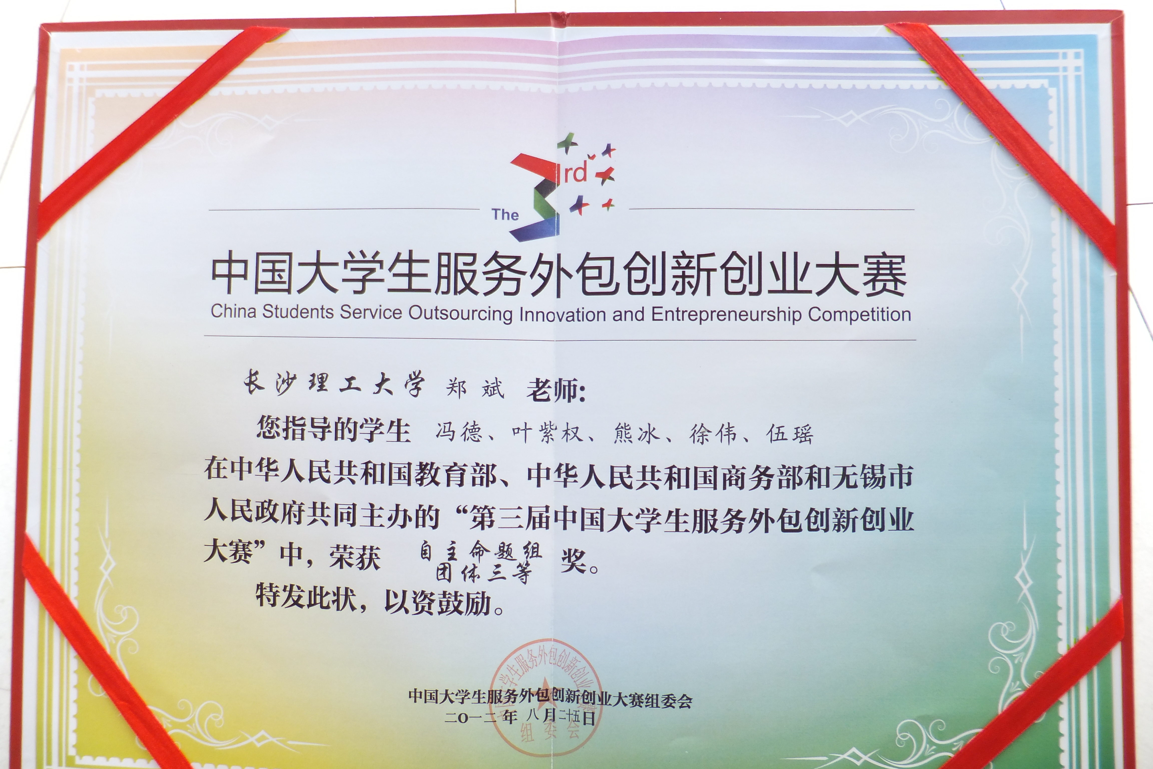 本届赛事以服务经济、信息技术、创意创新创业、应用导向和产学互动为主题,旨在搭建一个大学生服务创新与创业能力展示平台,引导社会公众和青年学生关注现代服务产业,促进高校教育改革,创新人才培养及评价体系,加快服务外包人才培养,为服务外包产业发展提供强有力的人才支撑。清华大学及香港、台湾等158所高校的246支团队、1200多名大学生参加了比赛。最终经过一系列的评审,必赢官网计算机与通信工程学院的5名同学组成的项目团队,在郑斌老师的指导下,斩获本次大赛自主命题组三等奖。
