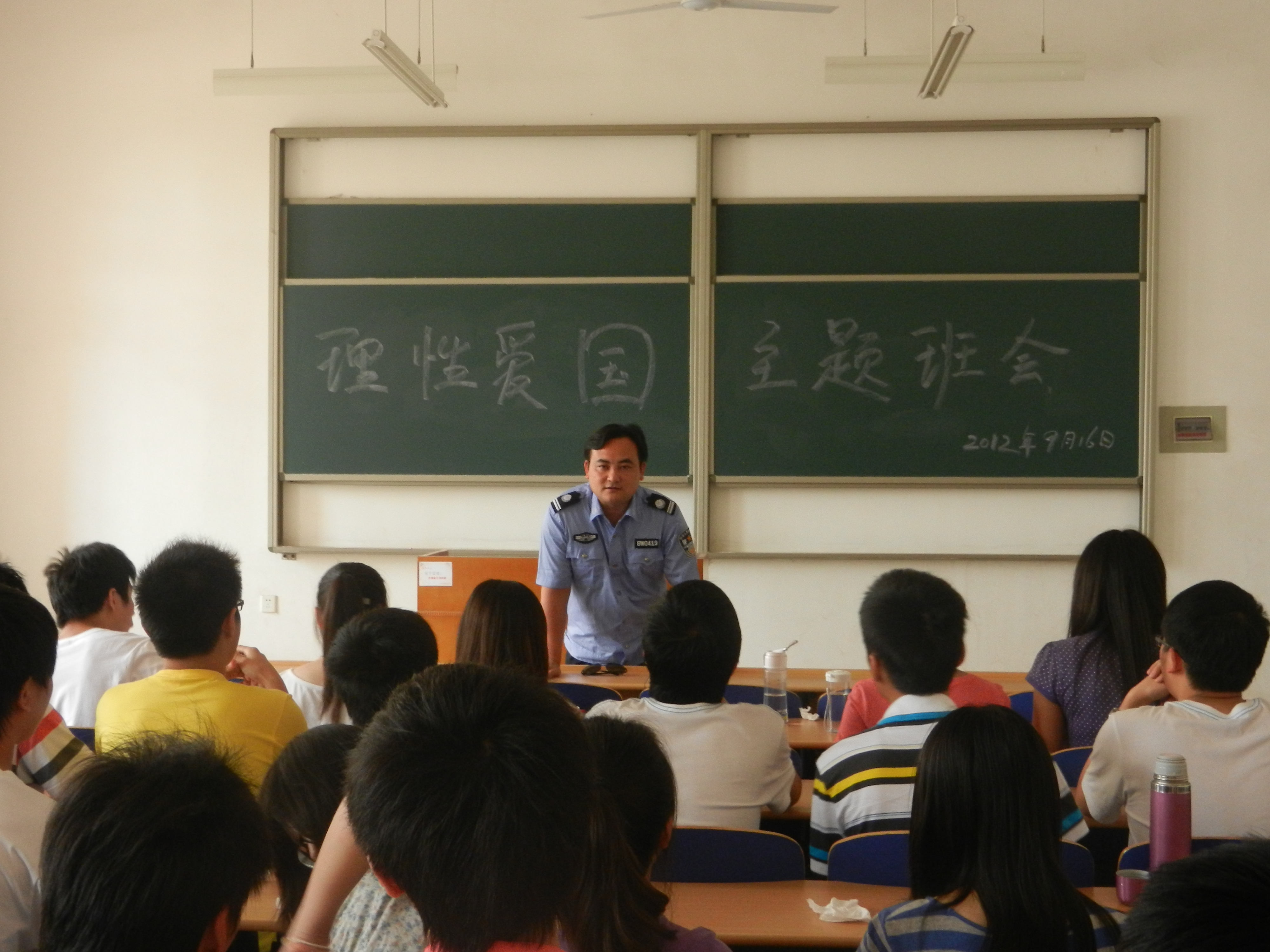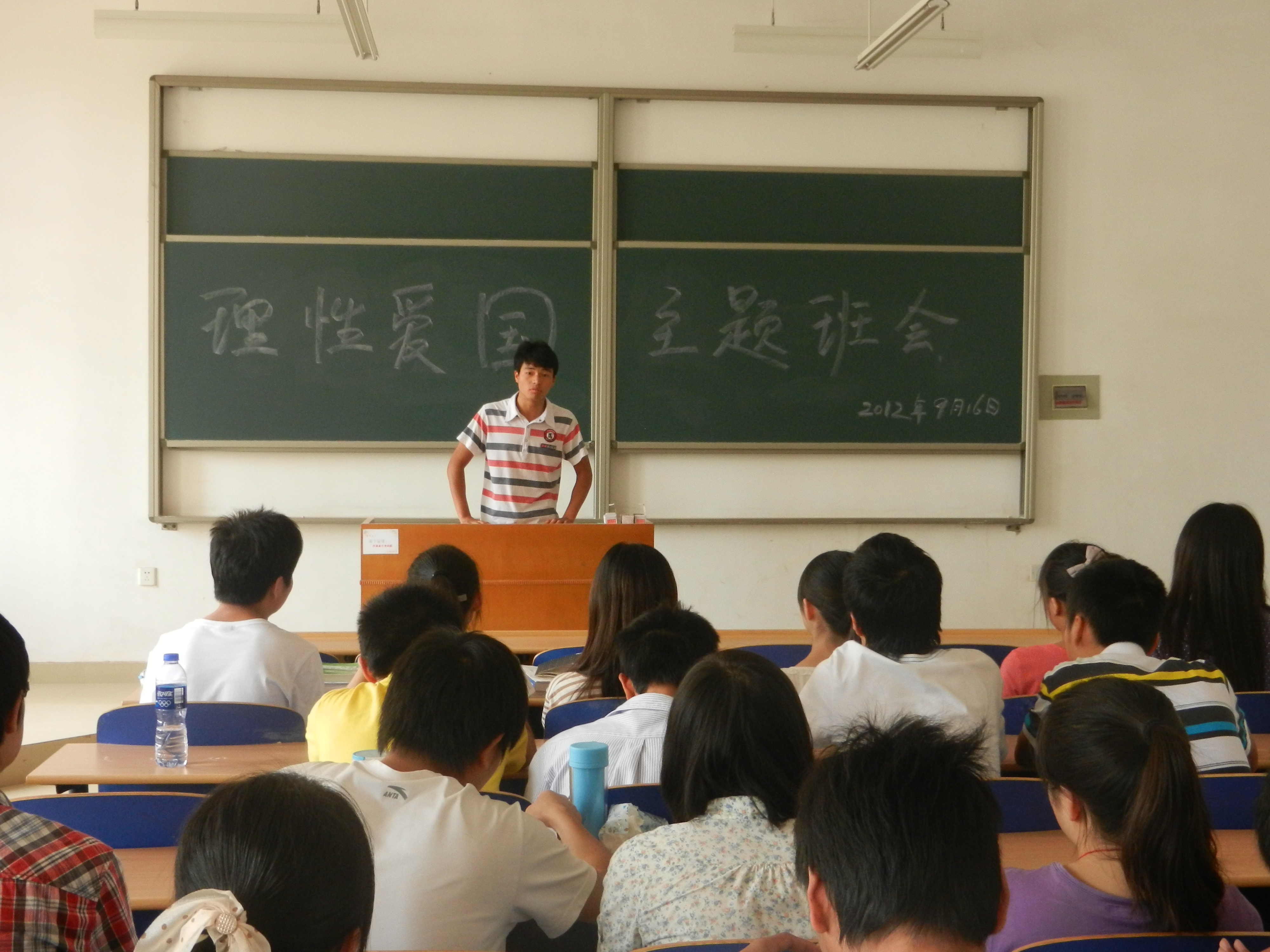 9月16日,年级辅导员、各班班主任组织学生召开 “理性爱国才是真正爱国”主题班会,以多种形式引导学生理性爱国。各班在教室、在寝室、在草坪开展不同形式的爱国座谈会。