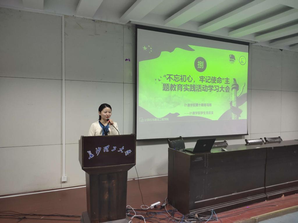 10月17日,计通学院于金盆岭校区12教200举行了“不忘初心、牢记使命”主题教育实践活动学习思政课。院党委副书记陈华,院学工办主任肖凤出席本次。本次课由院团委书记潘枝花主讲,团委副书记刘芊仪主持会议。学院各年级党团干部代表、计科1801班全体同学参加学习。