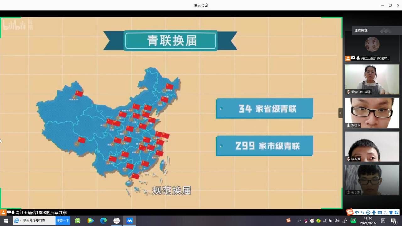 8月16日、17日晚,计通学院组织全院各团支部通过线上平台,收看了全国青联十三届全委会、全国学联第二十七次代表大会网络直播,并开展学习分享会。