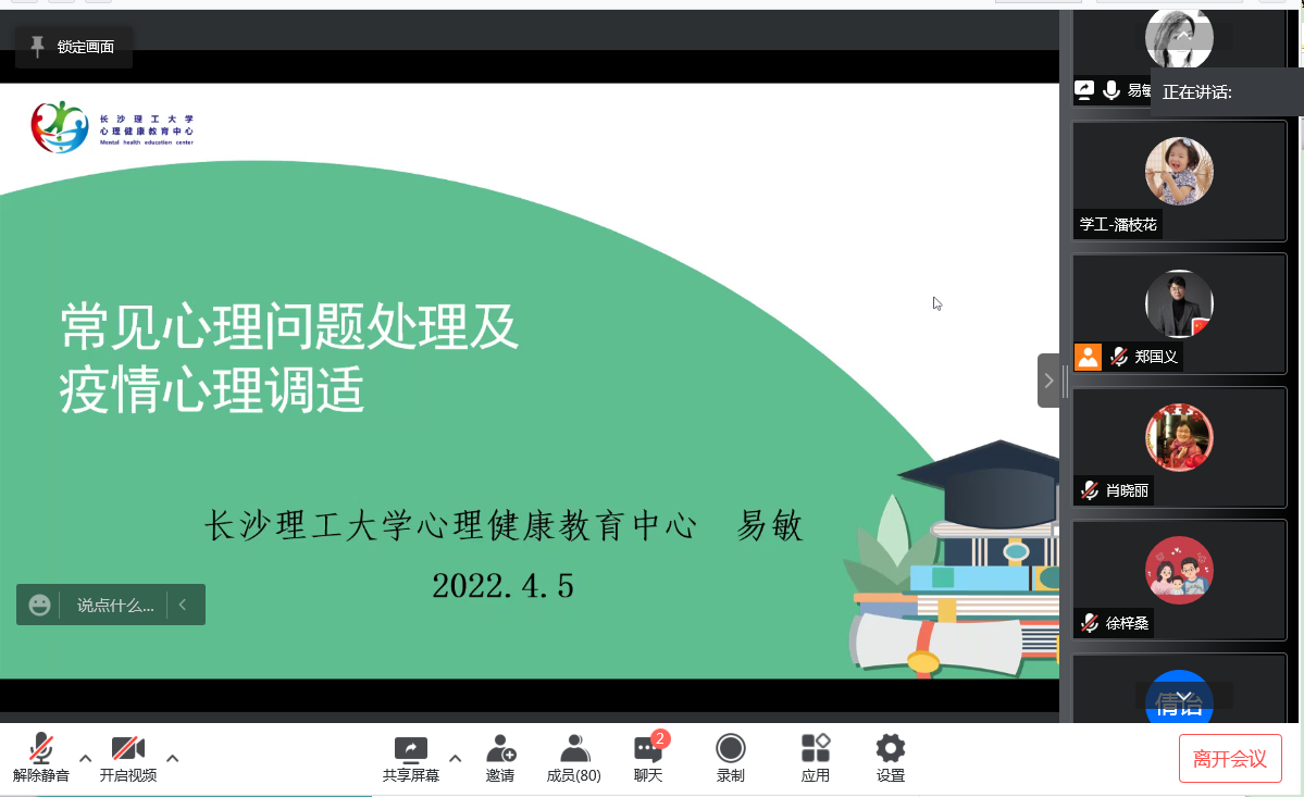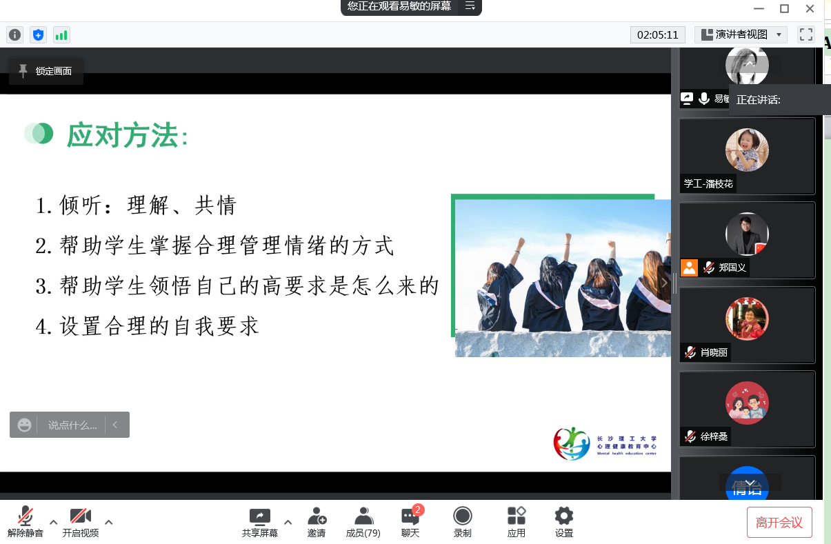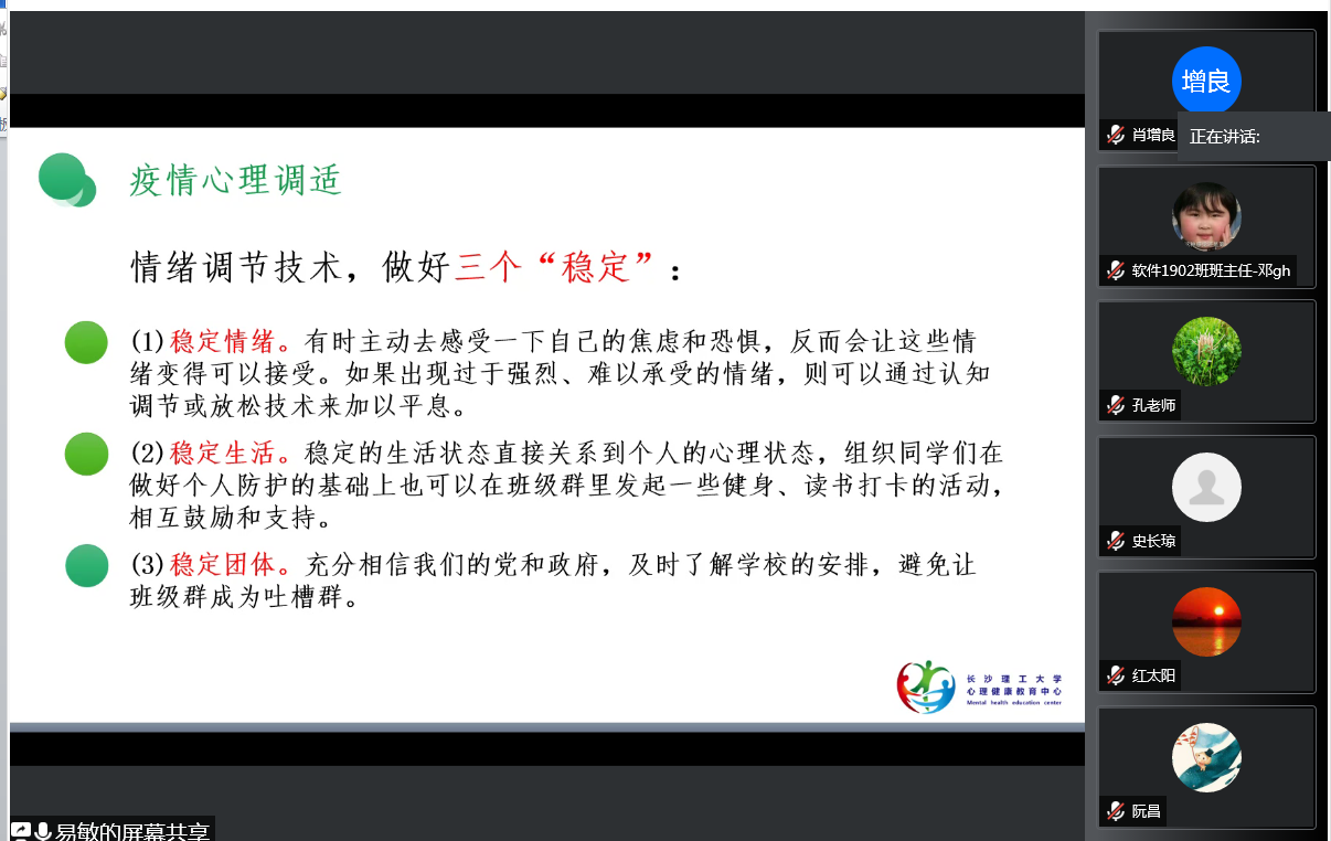 易敏首先讲解了心理健康状态和心理问题/疾病状态的区别,结合学生心理问题干预中的典型案例,为老师们讲解了常见心理问题类型,分析了心理问题产生的原因及应对处理的方式,指导老师们时发现和甄别学生的异常状态,通过倾听、共情等方式让学生得到心理的慰藉,对于可能的心理危机事件,班主任、导师应及时进行学院内部的转介,并协同学工做好干预处理工作。易敏还就疫情期间心理调适进行了指导,传授了“三个稳定”的情绪调节技术,即稳定情绪、稳定生活、稳定团体。易敏还重点推介了学校心理援助的渠道以及湖南省疫情期间心理咨询热线。