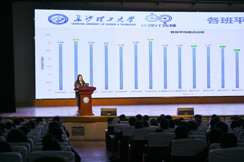 唐菲楠首先通过全年级绩点排名、四六级通过率等数据展开介绍2022级大三上半学期学情及日常分析,从个体进步显著、专业差异凸显、寝室生态两极化三个方面进行特征总结,希望同学们能够平衡自己的学业与生活。