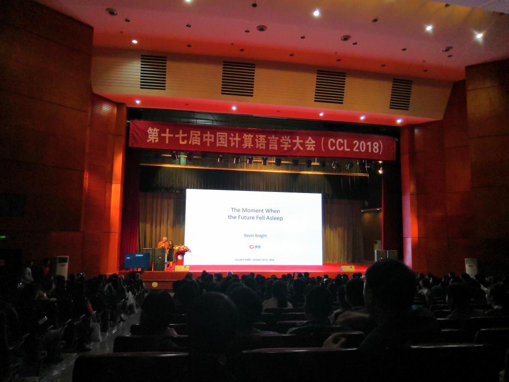 10月20日上午,滴滴出行自然语言处理首席科学家Kevin Knight教授在437必赢会员中心大会堂做了题为“The Moment When The Future Fell Asleep”的第十七届中国计算语言学大会主题演讲,吸引了大批专家学者聆听学习。