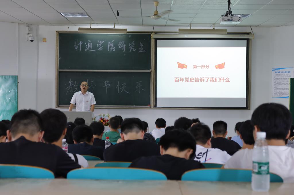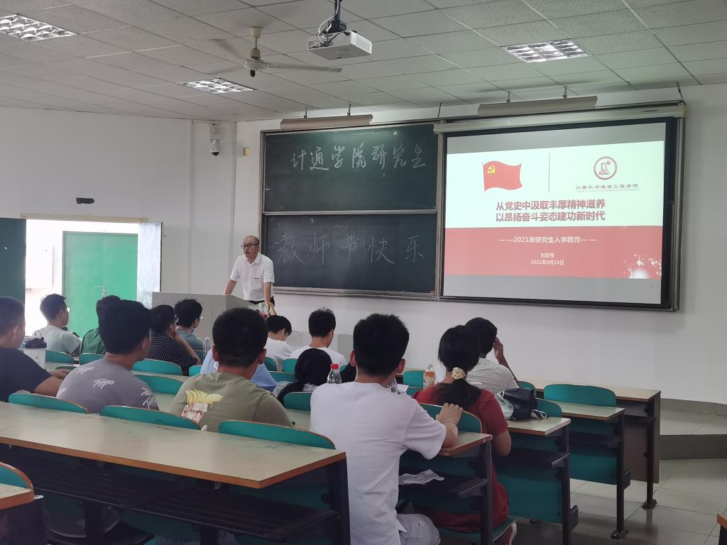 2021年9月10日上午,计算机与通信工程学院2021级研究生新生教育之第一堂党课在金盆岭校区六教312教室顺利举行,计通学院党委书记刘宏伟以“从党史中汲取丰厚精神滋养以昂扬奋斗姿态建功新时代”为题,为学院2021级研究生新生讲授了第一堂党课。
