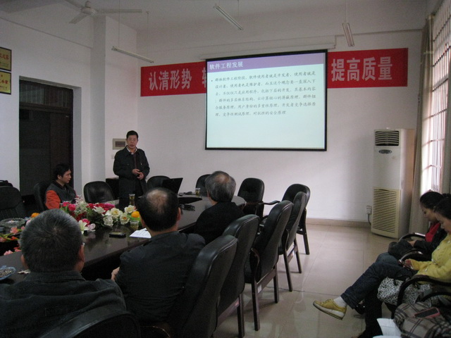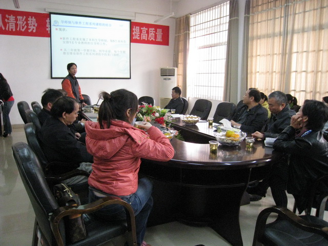 会议由院长助理谌海军老师主持,分为专业建设规划介绍、自由讨论和院领导发言三个环节。首先,软件工程系谢中科主任汇报了软件工程系专业建设的主要情况,介绍了现阶段所取得的主要成绩,同时全面分析了面临的问题,并提出了应对措施。接下来的讨论环节,各位老师就如何培养适应社会发展、满足市场需求的软件人才,从人才培养目标、课程体系建设、师资队伍建设和实践教学建设等方面展开热烈的讨论。特别是关于本科生导师制与《软件工程》系列课程基地建设如何结合,老师们提出了大量自己的看法以及建设性的意见。