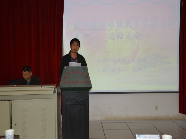 方琼书记就学院党的群众路线教育实践活动取得的效果、形成的经验,以及在以后的工作中如何推进学院全面深化改革等几个方面作总结报告。书记在报告中指出:“在本次教育实践活动中,学院努力做到了规定动作不走样、自选动作接地气。一方面,在学校第四督导组的悉心指导下,严格按照学校党委要求,不折不扣地完成了三个环节的各项工作。另一方面,结合学院实际,学院创造性地将教育实践活动与学院发展建设紧密结合起来开展工作,有效的调动了教师教书育人的积极性,推动了科研工作、教学工作、研究生教育管和学生工作全面提升。”同时,用一组数据充分证明和记录了计通学院在党的群众路线教育实践活动过程中的努力。