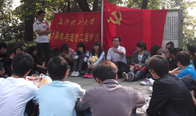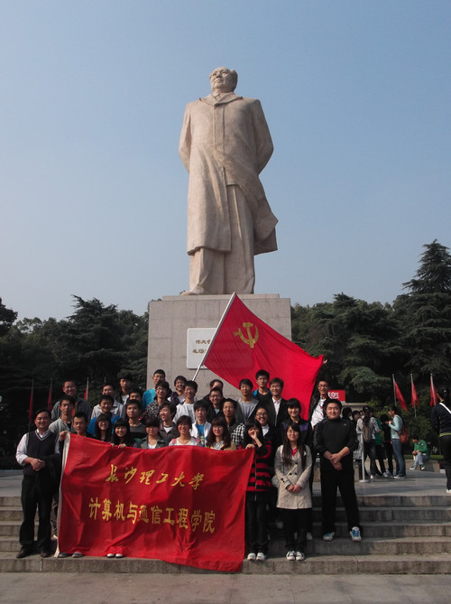 早上8点半,学员们从云塘出发,10点到达东方红广场,全体学员在毛主席的雕像下合影留念。10点半左右,在伍接朝老师的带领下,活动负责人谭飞刚、佘灿、何克岩、席斌同学组织全体学员代表开始登山。一路上,437必赢会员中心计通学院的院旗和中国共产党的党旗在登往岳麓山的路上随风飘扬,形成了一道亮丽的风景线。尽管山路崎岖漫长,同学们却兴致勃勃,一路上有说有笑,非常热闹。经过将近40分钟的跋涉,全体学员代表到达黄兴墓前。在整理好队伍后,入党积极分子培训班班长席斌向同学们简单的介绍了黄兴的生平事迹,党校助理班主任谭飞刚同学带领全体学员代表高举拳头,在黄兴墓前,面对中国共产党党旗庄严宣誓。下午1点左右,伍老师组织学员们进行座谈,同学们在黄兴墓边席地而坐,围成一个圈,把零食当做午餐,一边吃着零食一边开始进行交流,来自学院本科生四个年级和研究生两个年级,计算机、通信、网络和软件四个专业的入党积极分子以及预备党员们在此刻就像亲密的一家人。伍老师向大家说明了此次来岳麓山的意义,简要的介绍了辛亥革命的和中国共产党历史,并带领大家学唱《国际歌》。在伍老师的带动下,同学们纷纷上场表演节目,交流活动一直进行到下午3点。