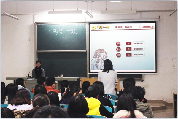 本次专题学习大会由学生党总支副书记潘枝花主持开展。潘枝花首先从道德的含义以及社会主义道德包括的四个方面入手,带领全体党员理解社会主义道德的内涵:公民基本道德规范、社会公德规范、职业道德规范、家庭美德规范,接着阐述了每一个方面的道德规范具体内容及在实际生活中的意义。在“两学一做”学习教育,“讲道德、有品行”强调的是共产党人的品德,以及在社会中恪守的公德,共产党员是普通群众中的普通一员,但是在道德水准的要求上,必须高于严于普通群众,共产党员对自己的道德境界要求应当更高。具体来说,大学生共产党员应该做到:一要严私德,二要守公德,三要明大德。要有恻隐之心,永葆朴素宝贵的情感;要有荣耻感,自觉自省自重;要有仁爱之情,以己及人,宽厚无私;要坚定理想信念,牢记全心全意为人民服务的使命,保持崇高的人生价值追求。