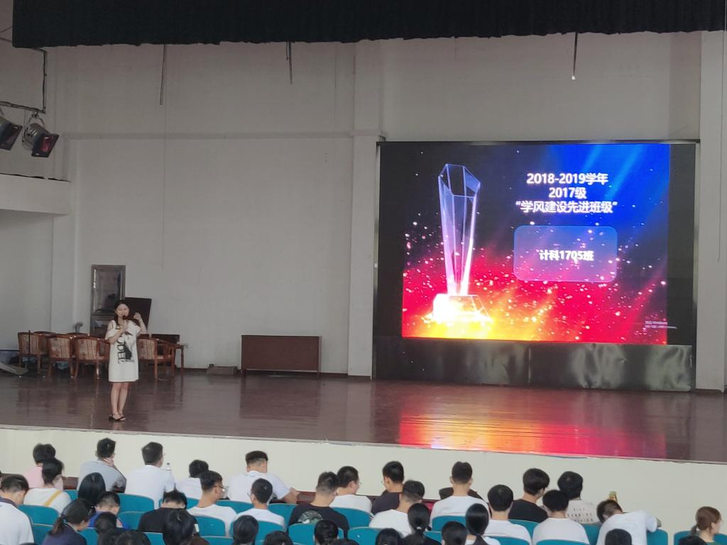 首先,潘枝花以对比图的形式对上学年的成绩进行了通报并进行了分析。她对优秀的同学给与了表扬,希望他们再接再厉;对成绩靠后的同学也给予提醒,期待他们在新学期有新的表现。然后,通报了各个班的四六级通过情况,强调四六级通过的重要性,鼓励大家努力学习,争取通过。之后她对“学风建设先进班级”——计科1705班进行了表彰,希望所有班级都以此为榜样,营造良好的学风,共同进步。