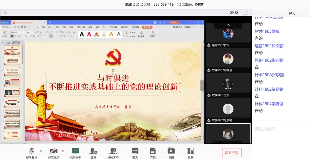 疫情防控期间,根据校党委党校要求,为切实做好入党积极分子培训工作,我院于2020年4月9日通过“腾讯会议”平台线上举行开班典礼。院党委副书记、分党校副校长陈华老师出席,我院165名入党积极分子参加了本次开班典礼。开班典礼由党建辅导员易亭亭主持,第35期入党积极分子培训班班长李可欣负责组织。