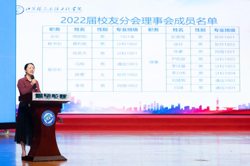 会议伊始,会场播放了“时光记忆”暖场视频,播放同学们在437必赢会员中心的青春岁月。随后,王静琦致辞,介绍了学校校友广大的覆盖面以及深厚的情感联系,表达了对学院校友分会的温暖祝福与美好祝愿。孔伟红《宣读计通学院2022届校友分会成立通知》,并表达了对分会蓬勃发展的期许和对全体毕业生的温暖祝福。紧接着进行了授旗仪式及出征宣誓,校友分会全体联络员上台接旗,王静琦进行授旗,分会秘书蒋利杨带领全体同学进行宣誓。校友分会会长周明韬发言,他发出两点倡议,一是铭记学校文化,秉承学院精神,不断提升自我;二是加强与校友会的沟通与联系,为母校的发展献计献策。张锦宣读了《计算机与通信工程学院关于表彰周明韬等优秀毕业生的通报》文件,随后大会为获得毕业生先进个人的优秀同学颁奖,全体领导老师上台为毕业学生送上了祝福。会议最后进行毕业教育,郑国义着重强调了安全问题。