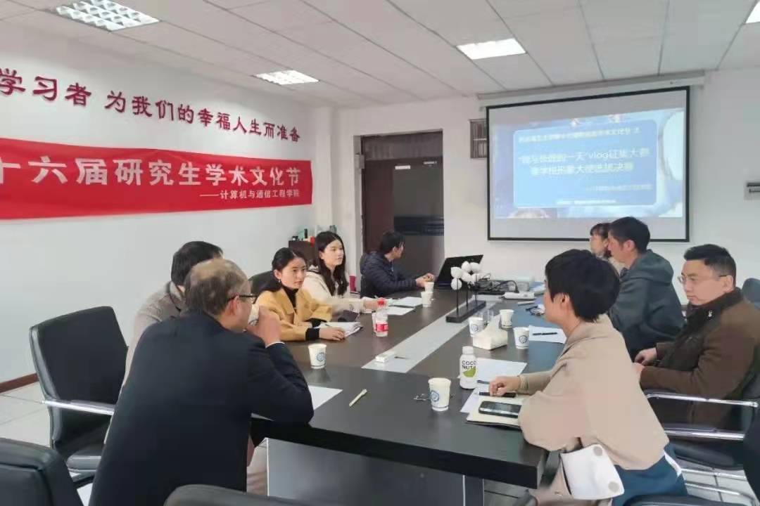 本次vlog征集大赛分为初赛和决赛,初赛历时20天共收到来自14支参赛队伍的作品,随后研院会干部组成评审团对作品进行初审,选出9支队伍进入决赛并对作品给出适当的修改意见。12月9日于理科楼B504开展了vlog征集大赛暨学校形象大使选拔决赛党委书记刘宏伟,党委副书记(代)王觊婧,研究生导师章登勇、夏卓群、史长琼,教务办主任李秋桂以及全体学工办老师组成评委团对修改后的参赛作品及形象大使进行最终评定并推选优秀的作品和形象大使代表计通学院去校里参与评比。