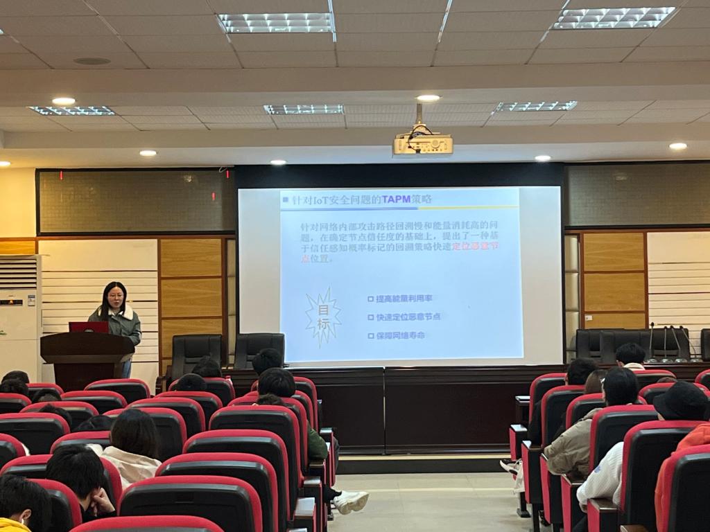 会议伊始,茹佳同学简单介绍了刘潇老师,并对刘潇老师的到来表示热烈欢迎。随后,刘潇老师对老师和同学们的到来表示感谢,随后他重点从物联网的简介、物联网的应用、物联网面临的安全问题、TLPD策略和TAPM策略五个方面的内容展开了详细介绍。首先,刘潇老师为我们简单介绍了物联网,并对物联网网络架构和物联网应用进行了简述。随后,由于物联网网络结构的多层次结构特点会面临各种类型的网络攻击,刘潇老师向我们介绍了典型的网络攻击,例如欺骗、篡改或重发路由信息、选择性转发、洪泛攻击和DoS拒绝服务攻击等攻击。在此基础上,刘潇老师又针对物联网安全研究背景进行了详细说明,物联网网络节点数量众多,基本上是自组织网络,通信方式为多跳路由通信,指出目前关于物联网安全研究的重点是如何快速辨识和定位恶意节点,从而保证物联网网络安全。最后,刘潇老师提出针对on-off攻击下恶意节点辨别困难和准确率低的问题,她提出了一种基于轻探测的路由策略;针对网络内部攻击路径回溯慢和能量消耗高的问题,在确定节点信任度的基础上,她提出了一种基于信任感知概率标记的回溯策略快速定位恶意节点位置,并对提出的TLPD和TAPM策略进行了全面汇报和分析。刘潇老师在作报告的过程中思路清晰,逻辑严谨,汇报有序,在场的老师和同学也认真听讲,学习新的研究思想,开拓视野,增进知识。