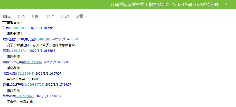 本次讲座持续一个小时,张老师的考研复试指导贴近现实,为分散在各地准备考研复试的学子指明了前进方向,进一步掌握了复试技巧。讲座结束后,学生纷纷表示,学习到很多宝贵的经验,对考研政策和复试调剂也有了更多的了解,同时更坚定了考研成功的信心。