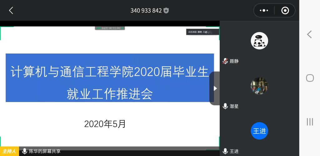 5月13日,我院召开2020年毕业生就业推进会线上会议,院长王进、党委副书记陈华、毕业班班主任老师、学工办老师参会。