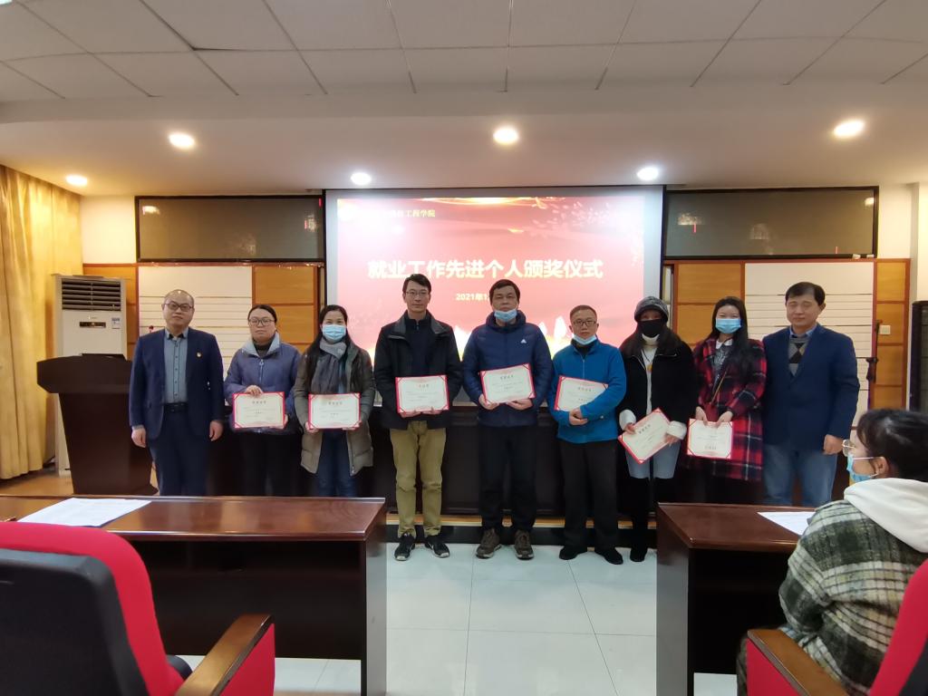 院党委书记刘宏伟宣读了《关于表彰2019/2020学年就业工作先进个人的决定》,对王静等7名班主任、何施茗等6名结对帮扶困难学生成功就业的教职工进行通报表彰。刘宏伟和院长王进一起为获得表彰的老师进行了颁奖并合影留念。