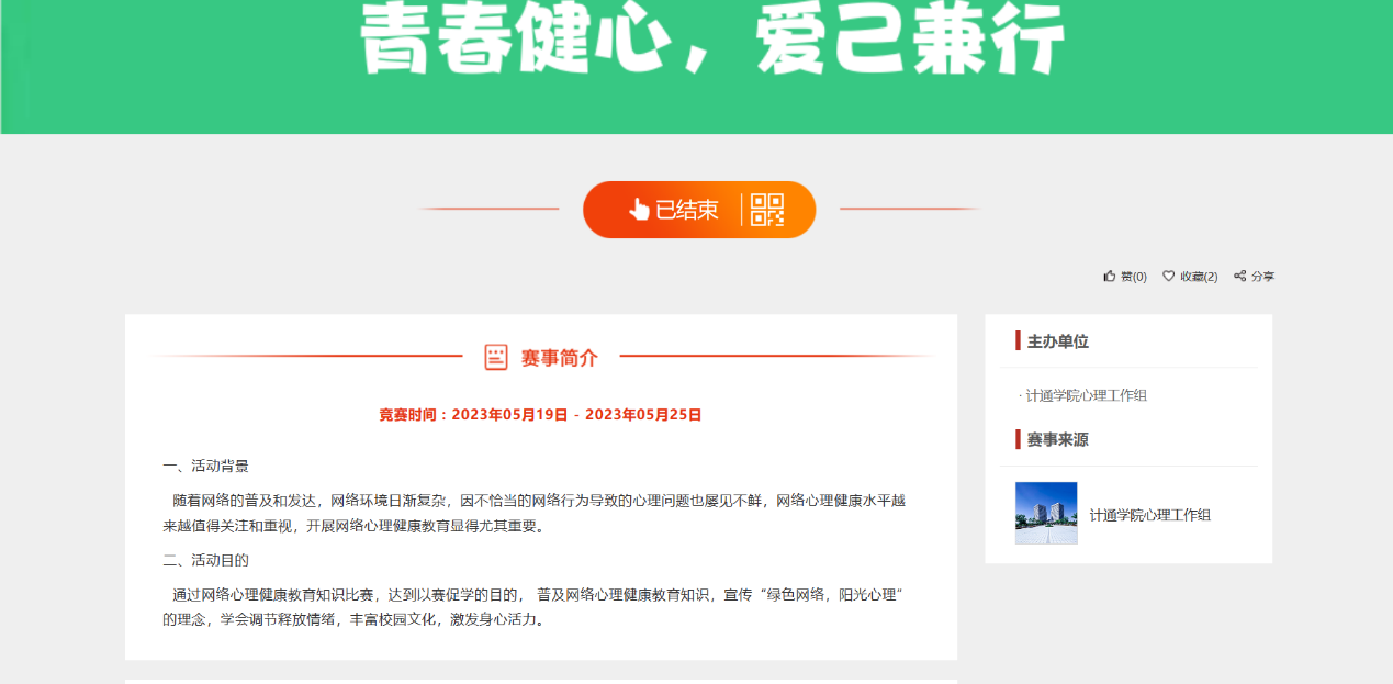 5月19日至5月25日,计通学院举办“清朗网络,青春健心”525网络心理健康教育知识大赛旨在通过网络心理健康教育知识的普及和传播,提高青少年的心理素质和网络安全意识,从而保障他们的身心健康。