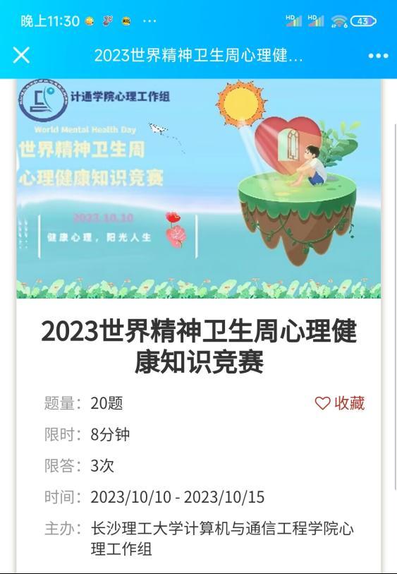 竞赛题库共有100题,分别围绕大学生心理适应、情绪调节、心理问题识别、常见心理问题判断等设置,每次参赛会从题库中随机抽取20题形成一套试卷,包括10道选择题、10道判断题。参赛者共有三次答题机会,按照答题时间和正确率取最高值排名。竞赛题目设置密切结合了大学生在学校生活中可能遇到的问题和情景,并能够指导大学生及时发现自己不好的心理情况,进行积极的处理;同时也加强了大家对心理健康重要性的认知,深入理解自助、助人。
