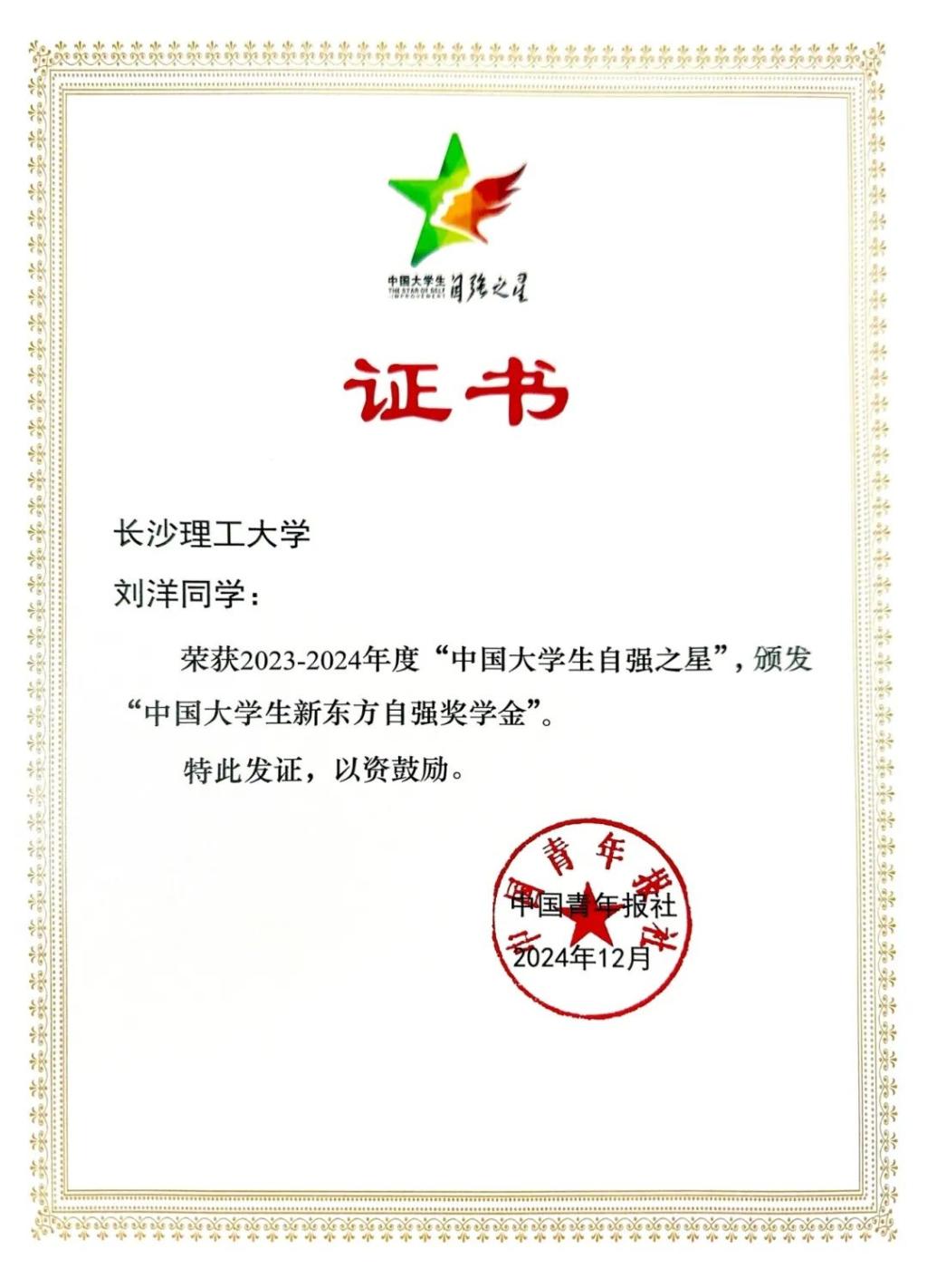 近日,由共青团中央、全国学联指导,团中央基层建设部、中国青年报社主办的2023-2024年度“中国大学生自强之星”奖学金推报活动结果揭晓,437必赢会员中心交通学院交通运输规划与管理专业2020级博士研究生刘洋获评“中国大学生自强之星”荣誉称号。