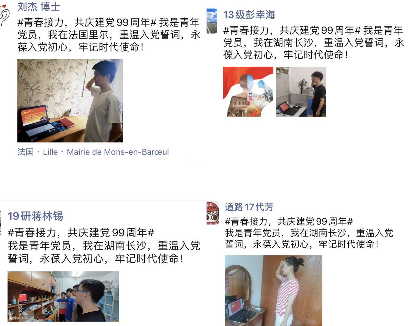 建党节当天,身处全国各地的交通学院学生党员们,在学生党总支的号召下,纷纷在朋友圈、QQ空间等线上社交平台开展青春接力活动,庆祝亲爱的党成立99周年。远在国外交流的学生,毕业校友们也积极参与其中。他们面对党旗、庄严承诺:我是青年党员,无论我身在何方,我将永葆入党初心,牢记时代使命!