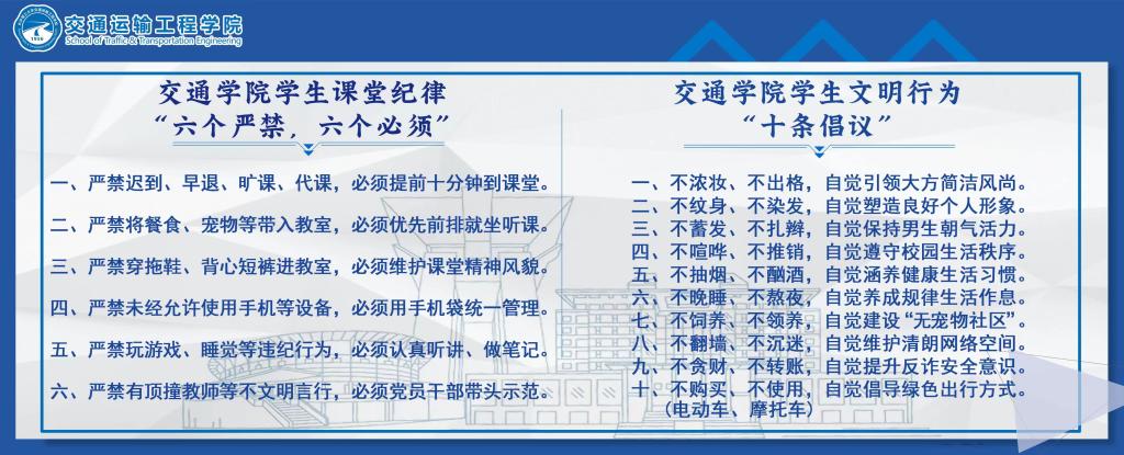 随后,各班组织同学们学习交通学院学生课堂纪律“六个严禁,六个必须”,学生文明行为“十条倡议”,在学生日常着装、行为、言语等方面提出要求,全面提升同学们的综合素质,杜绝早退、旷课、上课睡觉等现象,督促和引导同学们养成良好习惯,营造良好学风氛围。