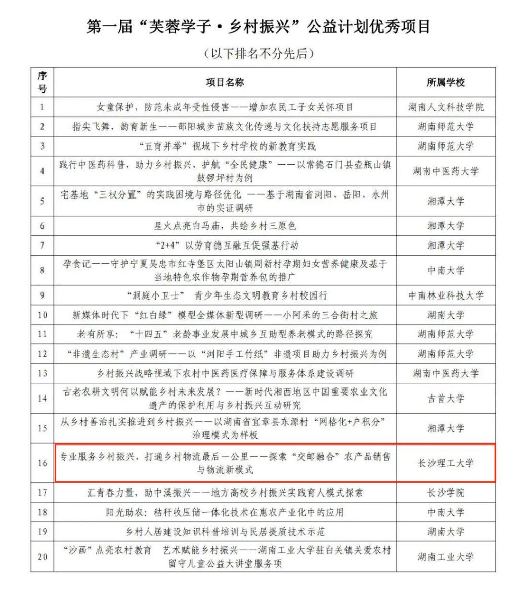 近日,由中国青少年发展基金会、共青团湖南省委、湖南中烟工业责任有限公司主办的第一届“芙蓉学子·乡村振兴”公益计划举办优秀项目评审会。交通学院蜂巢团队“专业服务乡村振兴,打通乡村物流最后一公里——探索‘交邮融合’农产品销售与物流新模式”获评优秀项目。