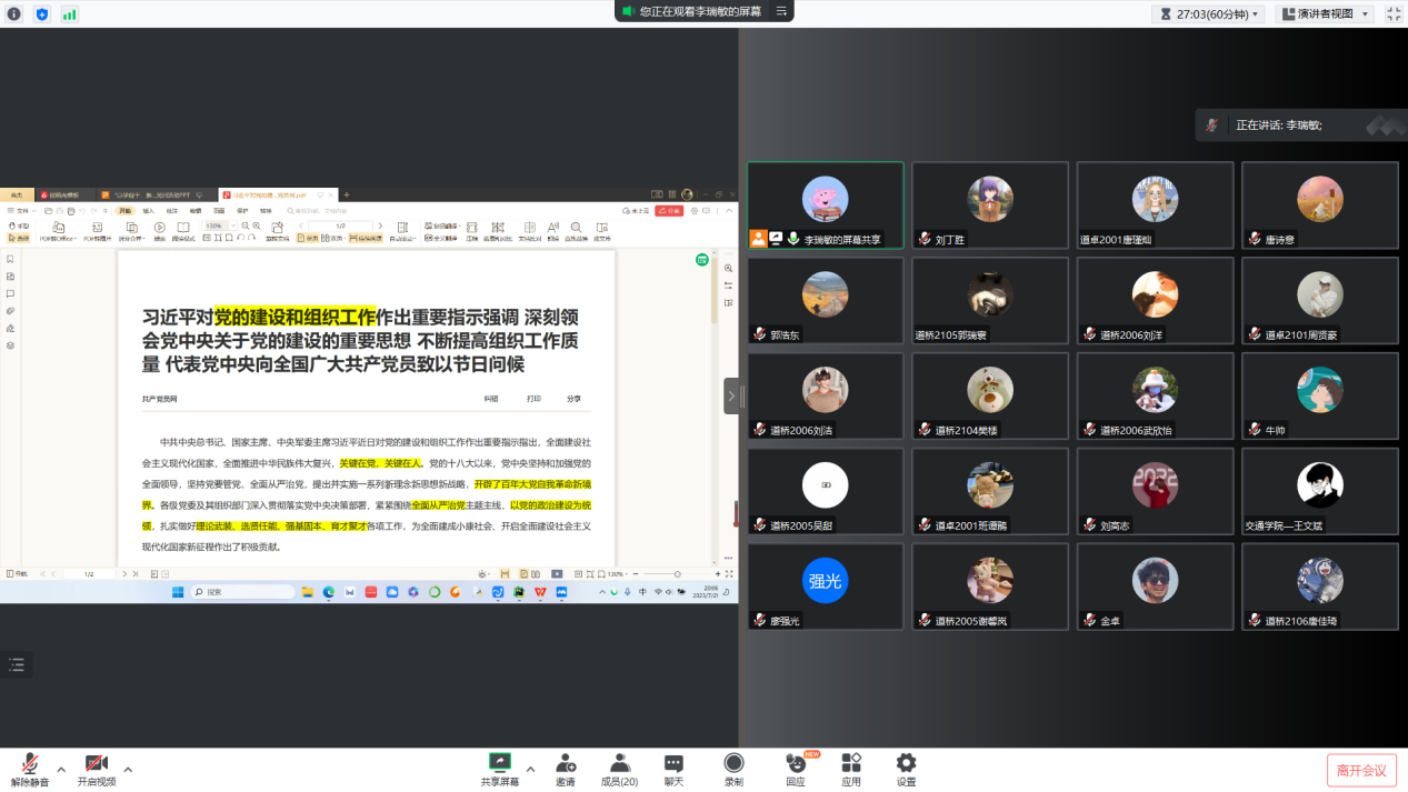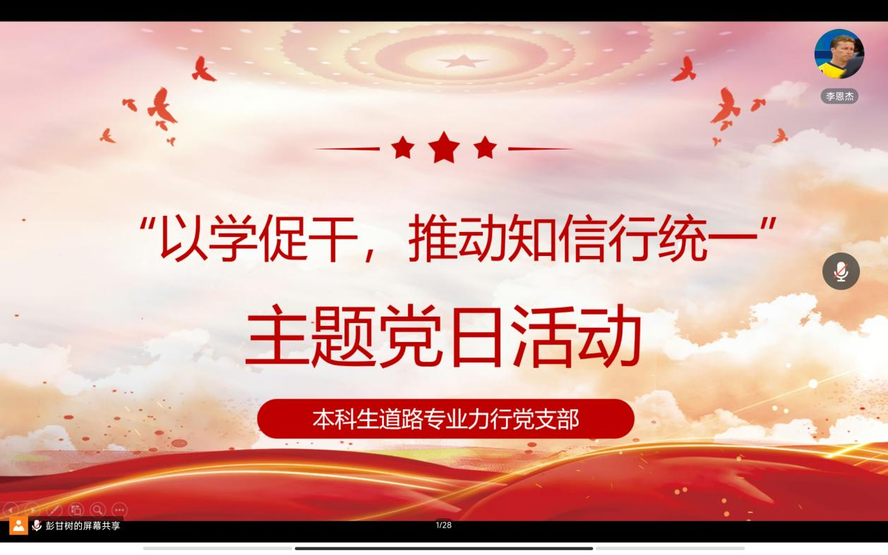 各支部支委带领支部全体党员以线上集中学习的形式,学习了习近平总书记在主持中共中央政治局第六次集体学习时发表的重要讲话、习近平总书记对党的建设和组织工作的重要指示等重要内容。测绘支部郑淇真以“马克思主义中国化的三次飞跃”为重点进行微党课的讲授,回顾了中国共产党的百年奋斗历程,引导党员同志在不断学习中增强党性修养,提高思想觉悟并付诸实践活动。道路专业力行支部卢泽军重点讲解了习近平总书记近日对党的建设和组织工作做出的重要指示,即全面建设社会主义现代化国家,全面推进中华民族伟大复兴,关键在党,关键在人。
