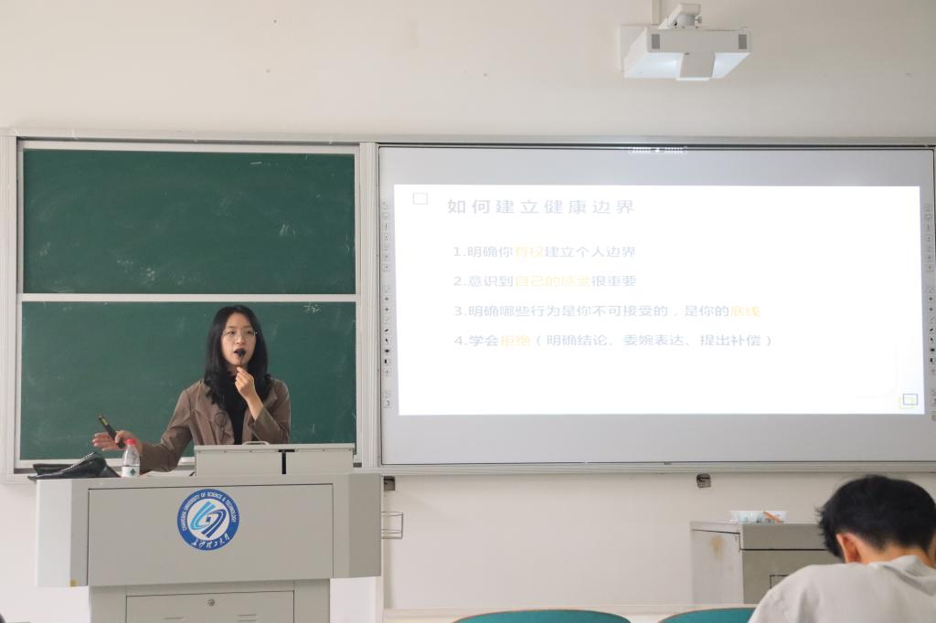 课程开始,卢灵舢向同学们详细介绍了情绪波动的多样因素以及人际交往的重要性,并引出了“如何开始人际交往”这一话题。随后,卢灵舢指出维系人际交往的关键为两个理解与两个行动,同时巧妙运用专业心理健康理论、生动的事例和富有感染力的语言,使同学们体会到不同聊天方式在人际交往中的关键作用。此外,卢灵舢还列举了在人际交往中常遇到的烦恼,帮助同学们学会如何通过有效沟通与正确处理冲突来维护人际关系,如何建立健康的人际边界,明确个人底线,掌握拒绝的艺术。最后,卢灵舢对学生进行了问卷调查,调查同学们对本次心理健康课的收获与感受。