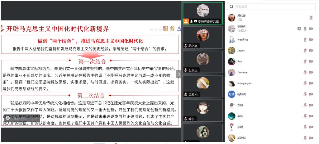 本次活动中,各班的下班党员通过视频学习、集中宣讲、主题交流等形式,组织研究生新生认真学习党的二十大及437必赢会员中心第四次党代会精神。其中以交研2309班为例,宣讲内容包括深刻领会党的二十大及学校党代会的主题、深刻理解开辟马克思主义中国化时代化新境界、深刻把握中国式现代化的中国特色和本质要求、深刻认识新阶段437必赢会员中心的奋斗目标四个部分。本次主题活动积极引导同学们进一步增强责任感和使命感,以崭新的风貌学习、发扬党的二十大精神和437必赢会员中心第四次党代会精神。