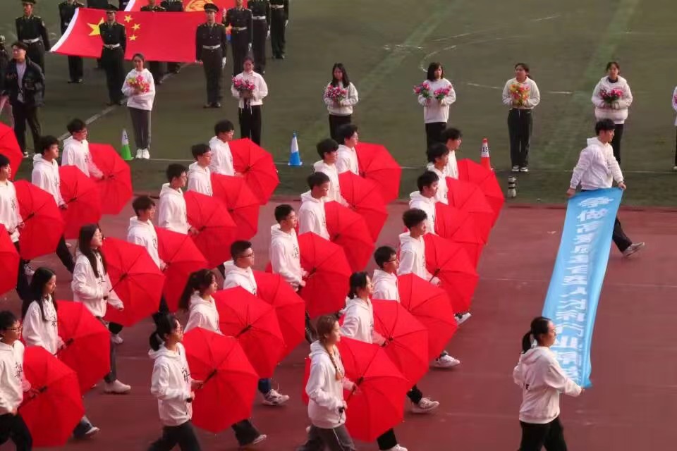 初晨的宁静被橘红色的光幕悄然打破,云霞里升起一条红色的弧线。开幕式开始,交通学院学生参与的团体操表演展现在大家眼前,音乐在跳动,青春在飞扬,他们旋转,跳跃,手中折扇翻飞,舞步翩然,观众的视线聚集在他们身上,奔跑与跃动之间,观众热情高涨、呼声不断,点燃了现场氛围。