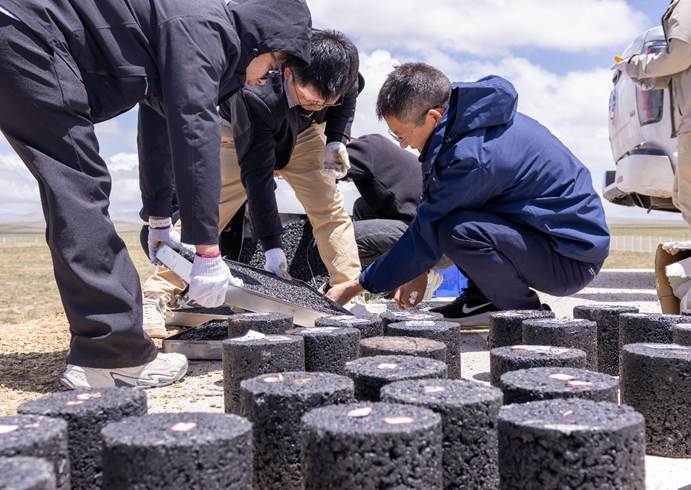 在观测基地,高原环境的稀薄空气,让每一次肢体动作都额外沉重。团队成员们抱着方形、圆形、柱状的沥青块,向暴露实验场地搬去。空气里似有无形阻力,脚步带着缺氧后的虚浮,将沥青块整齐准确地放在指定位置,这是团队自研的高性能材料,承载着为高原道路“筑甲”的期待。邓佳荣将沥青块稳妥安置后,才缓过气介绍:“我们带来的自研高性能沥青材料,会在试验场开展为期一年的紫外老化、直接间接拉伸、单轴压缩实验。”字句间,呼吸仍因高原反应而急促。后续阶段,这些未来的“公路铠甲”将持续经受高原强烈的紫外线照射、昼夜大幅温差变化以及冻土冻融循环的多重“考验”。