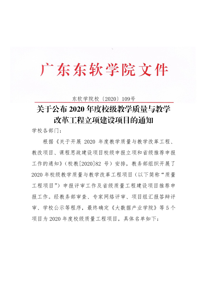 关于公布 2020 年度校级教学质量与教学改革工程立项建设项目的通知